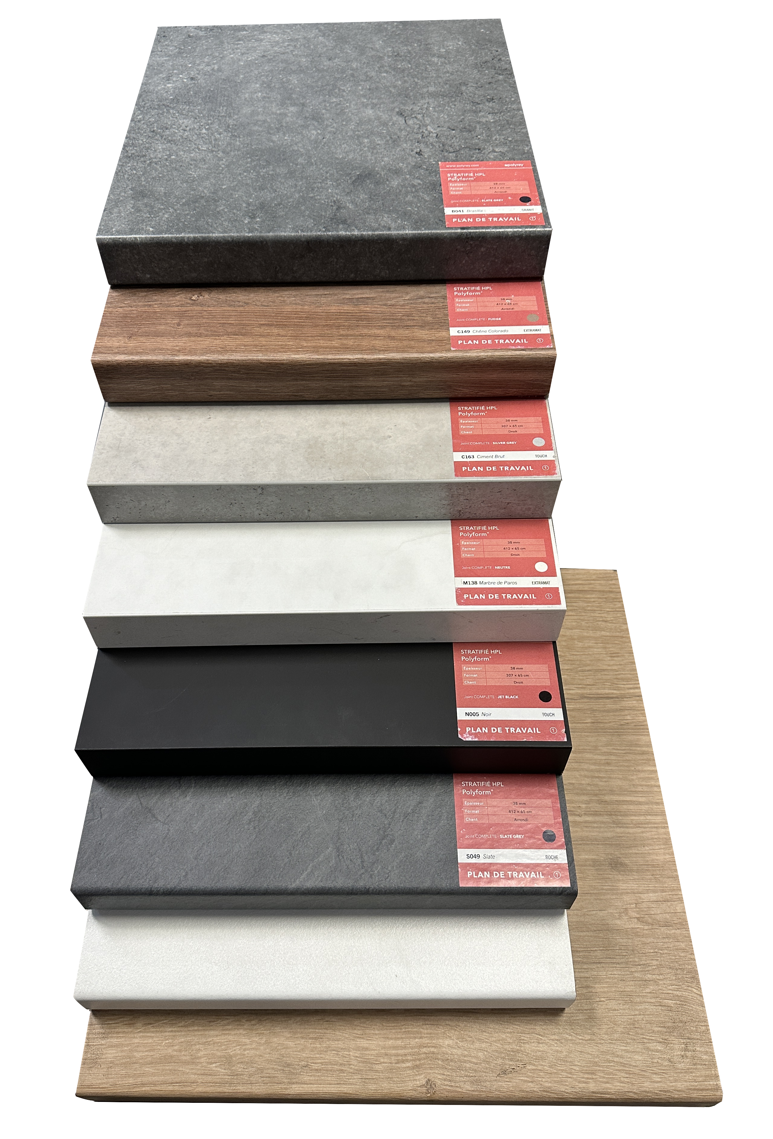 Vous trouverez chez nous différents coloris en tablettes de cuisine (plan de travail), ainsi que des panneaux en aggloméré stratifié deux faces blanches, de 3,05 x 1,30m.